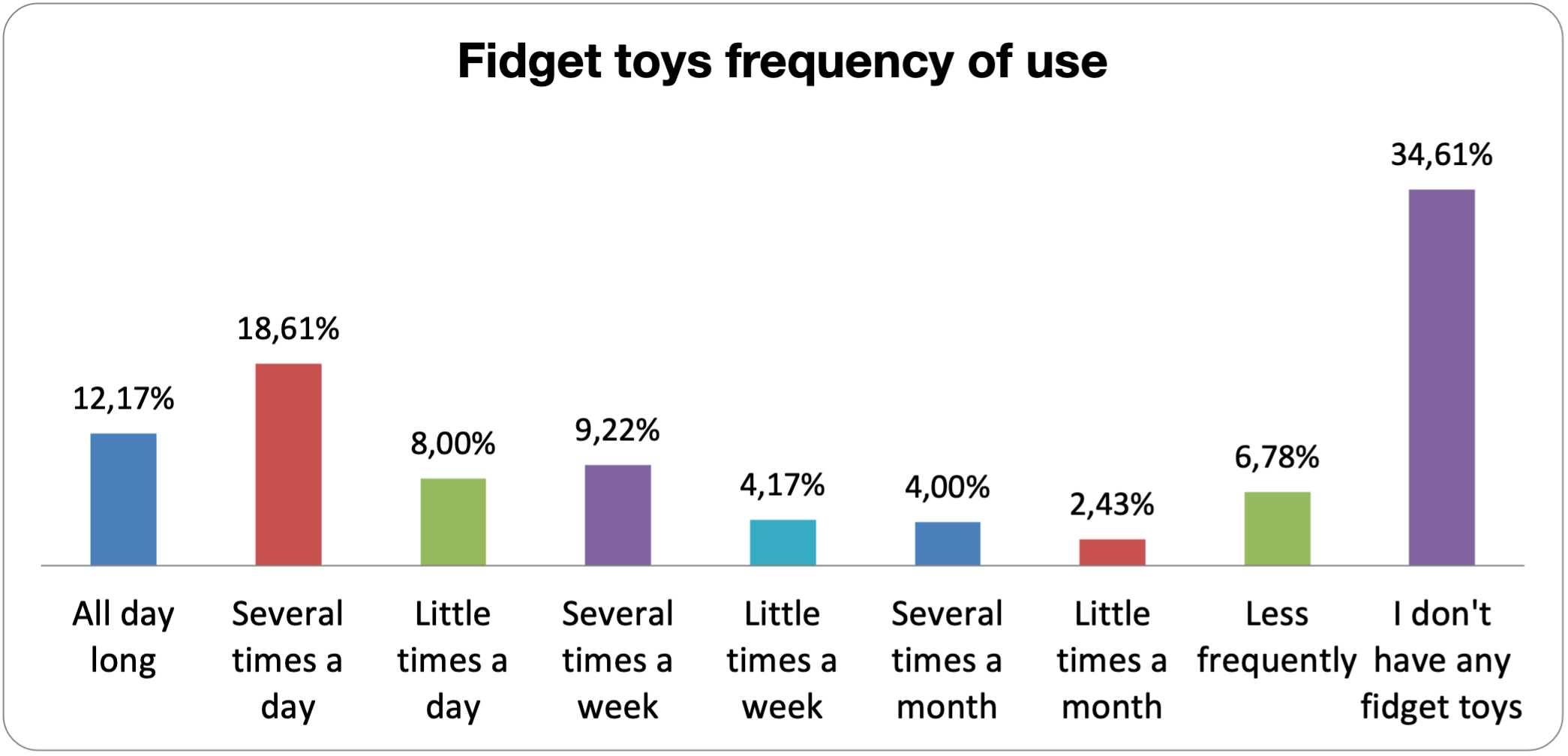Our findings were enlightening. An impressive 85% of participants admitted to engaging in some form of fidgeting, such as drumming fingers or fiddling with objects. Furthermore, more than 65% of adults reported owning fidget toys, with 39% using them daily. This data underscores the significant demand for fidgeting tools among adults.
